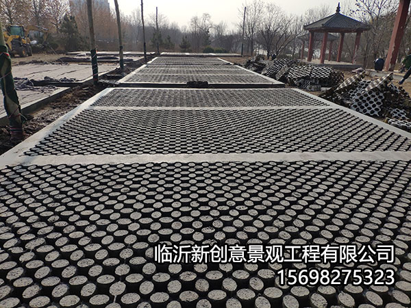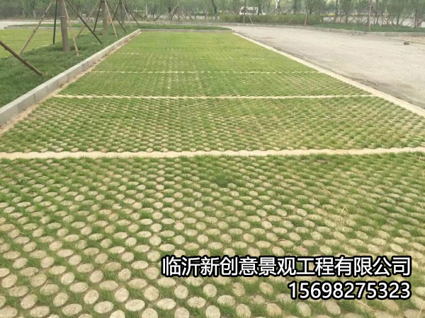 植草地坪是通过钢筋将用模具制作出来的混凝土块连接起来,形成一个整体,再在空隙中填满种植土,播种或栽种草苗的施工工艺。植草地坪与传统的植草砖相比整体性、稳定性好。由于有钢筋连接,不会出现传统植草砖的易破碎、局部沉降等现象,而且混凝土块的形状、图案及空隙距离可随意调整,施工起来更灵活,因此它适用于停车场地的铺设。