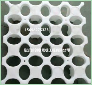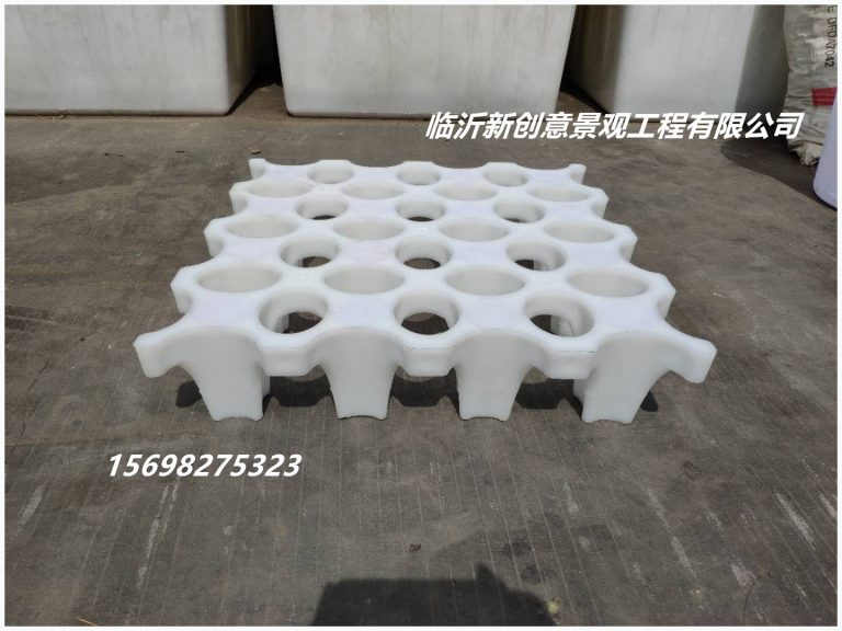1.高承载植草地坪混凝土模具,施工快捷方便,布局可调,使用较少的人力即可完成施工,易于维护,植草效果好,具有强度高,使用寿命长的特定。植草地坪模板和植草型腔封盖采用环保材料制成能够遇水自溶解,可大大减少植草型腔开孔的成本,而且不会对环境造成污染。
