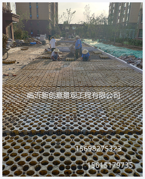 3.草皮一般用马尼拉草,此类草耐践踏,易生长。草皮铺设时应留出20mm左右的缝隙,并以品字形错开铺装。草皮铺好后,用水浇透,使草皮松软,再用小型压路机或平板振动机将草根打压至矩形格内(反复多次),使草根便于往下生长。高承载植草地坪,高承载植草矩阵格,高承载植草地坪施工就找临沂新创意景观。